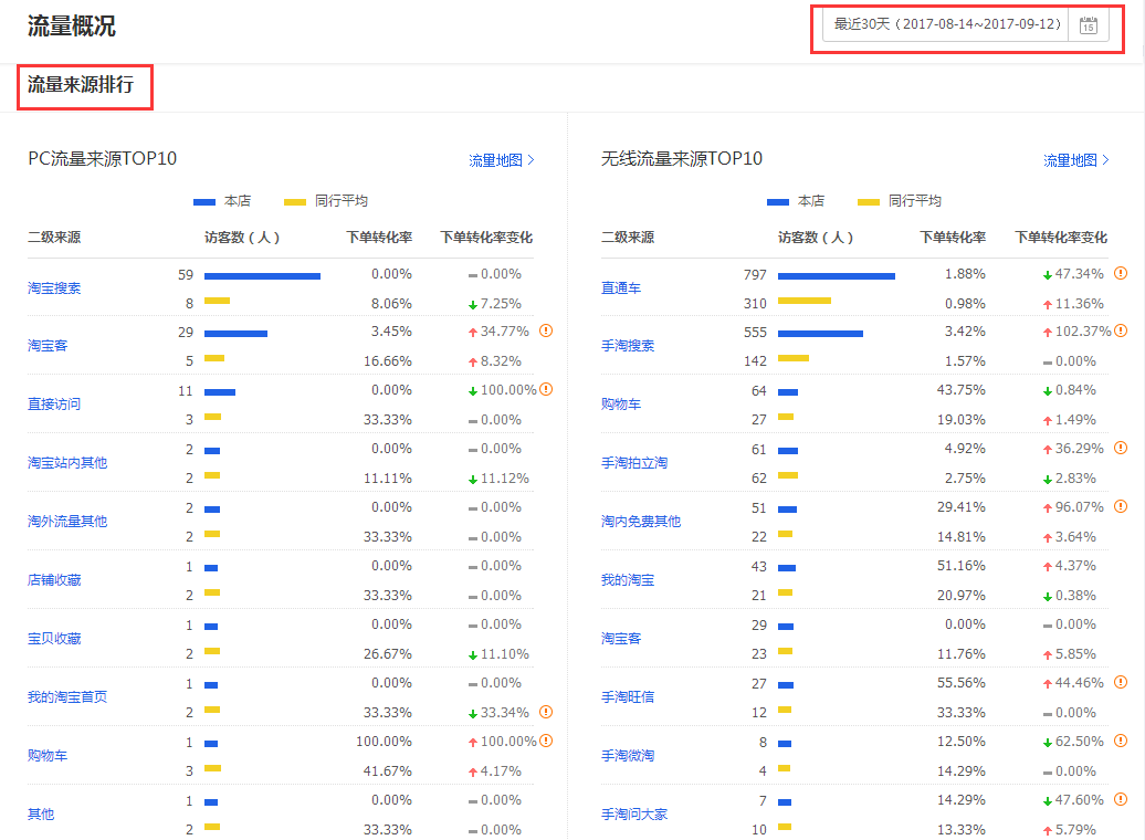 对于这里,我们不仅仅要去看前面的综合支付转化率,我们还需要去看各个的主流渠道的下单转化率。如果说你的主流量来源转化出现了问题,那么很有可能会导致这个流量渠道受到影响,特别是对于自然搜索和直通车流量。